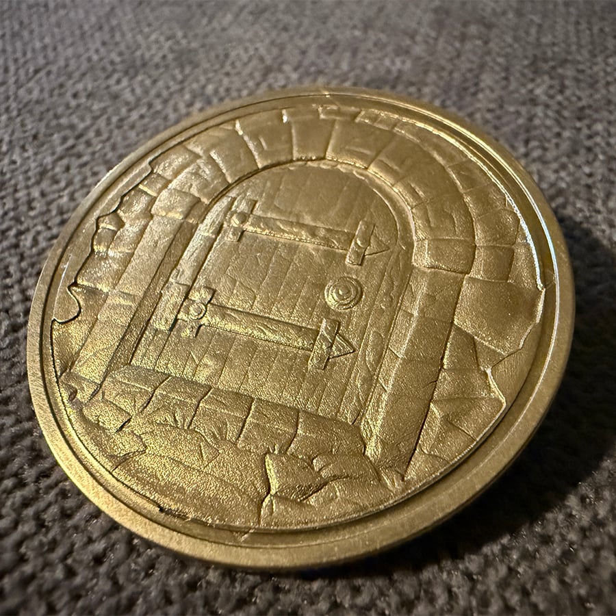 Designed and and created in my studio. Engraved out of a solid brass blank coin using a 30w Fiber laser then finished and hand-polished. This has a dragon on one side and a dungeon entrance on the other. The Dungeon or Dragon Decision Coin is a challenge coin size and weighty enough in the hand to feel tangible. 40mm diameter and 2mm thick