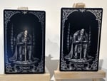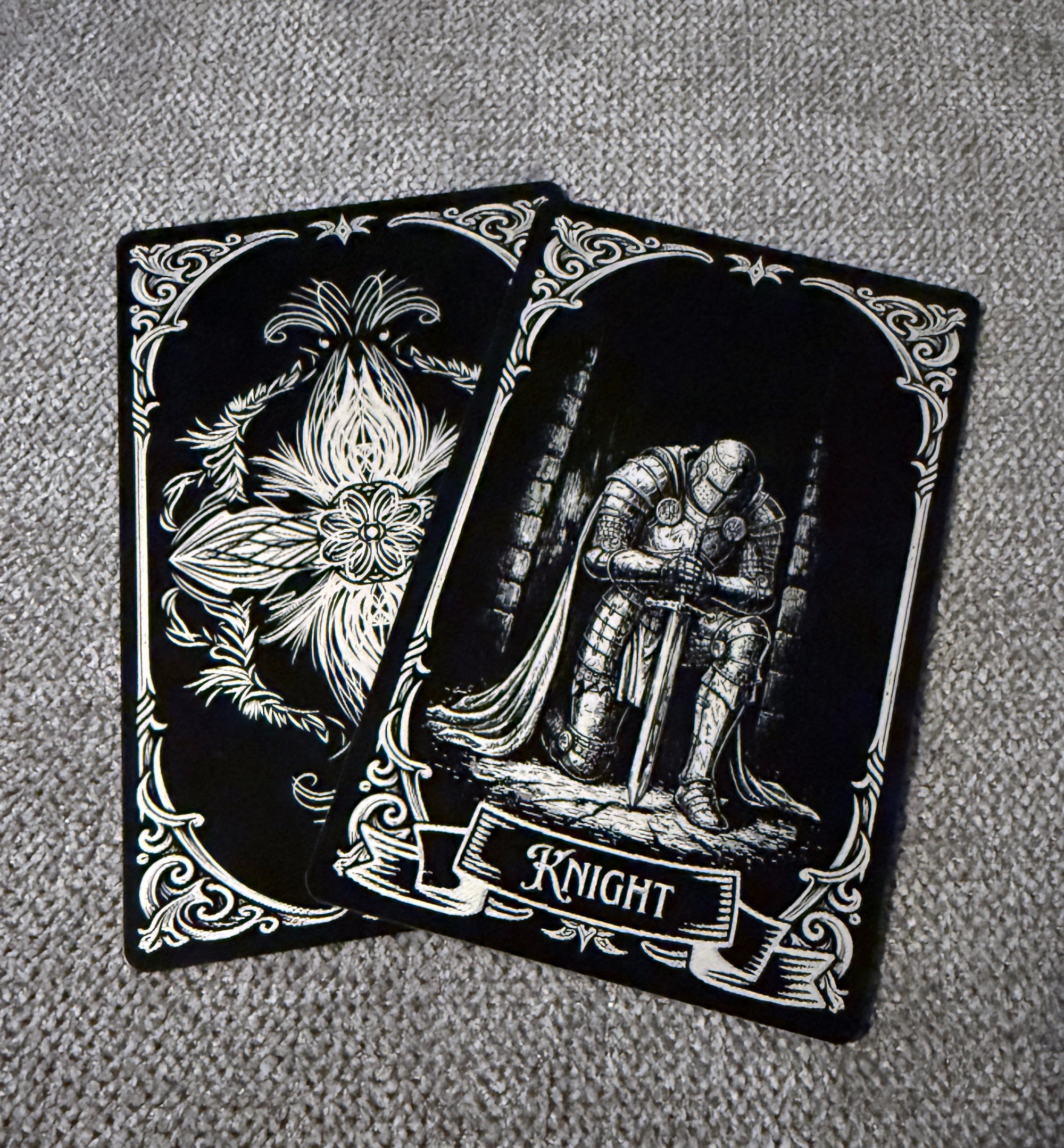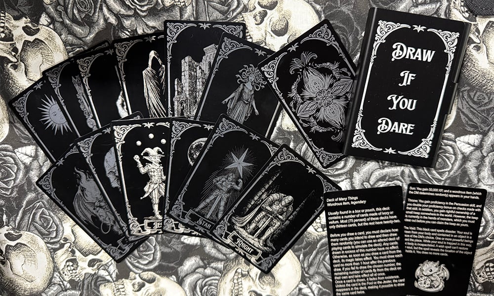 The Deck of Many Things is one of the most popular magic items in Dungeons and Dragons. I designed this deck in the art style of classic TTRPG and Tarot art and engraved it into black aluminum cards using fiber and diode lasers in my studio, hand-finishing each card. Cards are engraved using an X-Tool D1 Pro diode laser for a glossy metal engraving or a Gweike g2 pro fiber laser for the frosted white aluminum. They are accompanied by rules cards and a black aluminum card holder, both engraved to a frosted white with the fiber laser for higher contrast and legibility of text.