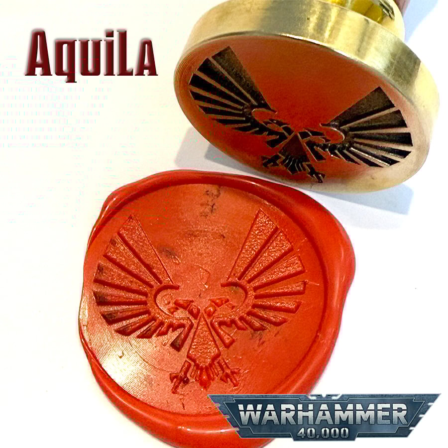 Warhammer 40k Wax Seal laser engraved metal stamp head with screw-on wooden handle. designed in Adobe Illustrator and engraved with the G2 Pro fiber laser, this version of the Aquila has raised wings to better fit a circular setup.